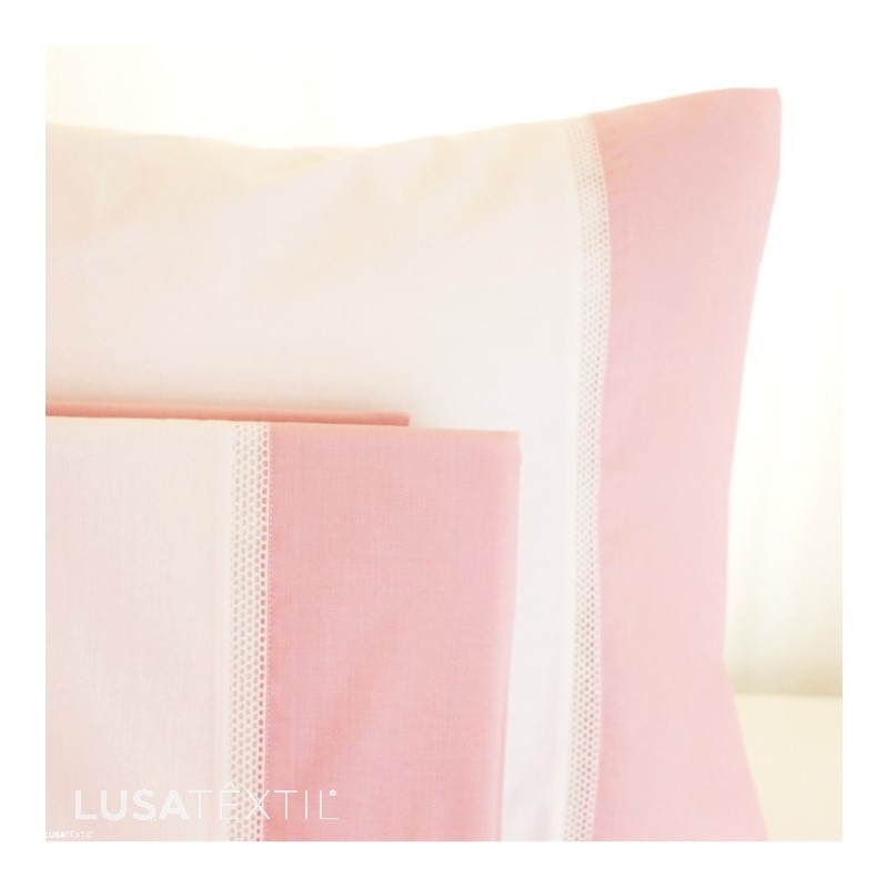Composição 100% algodão com renda no lençol de cima e fronhas