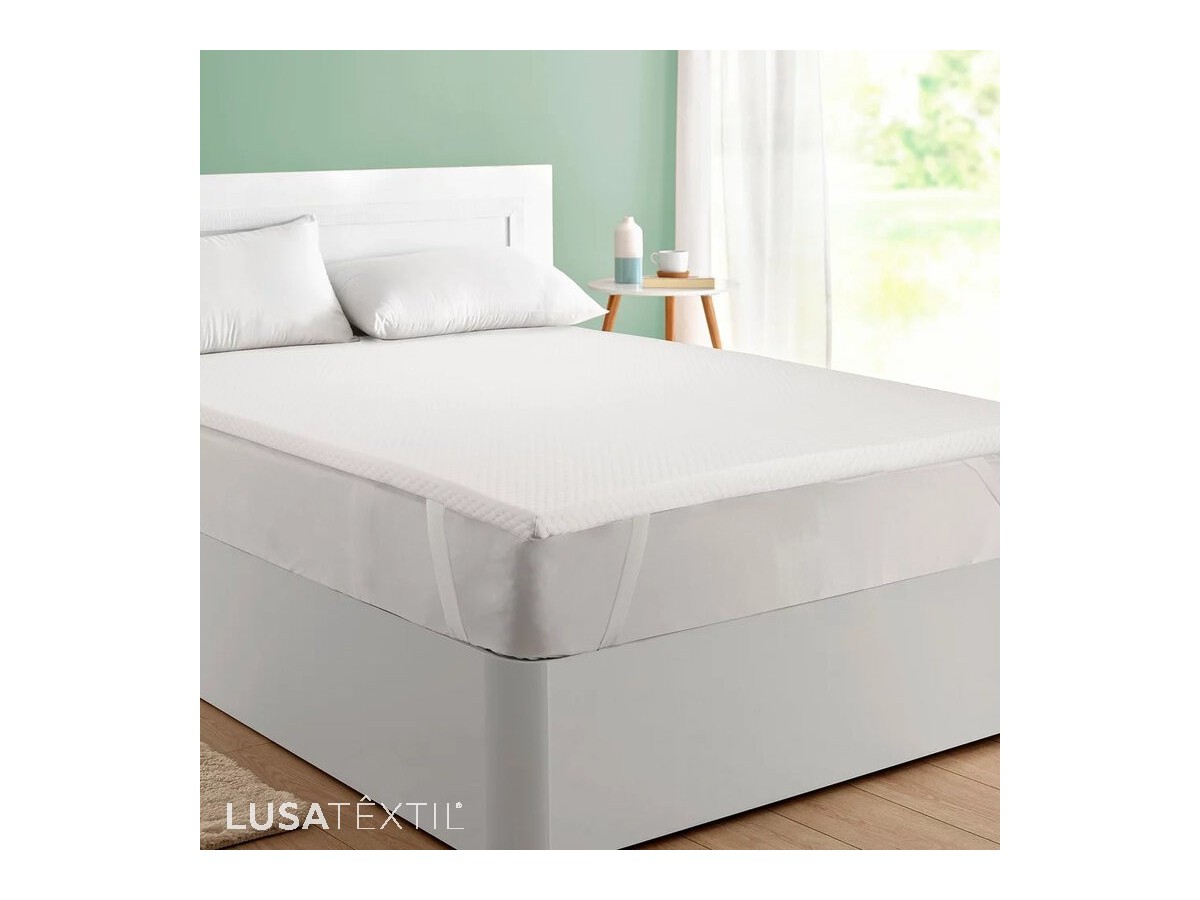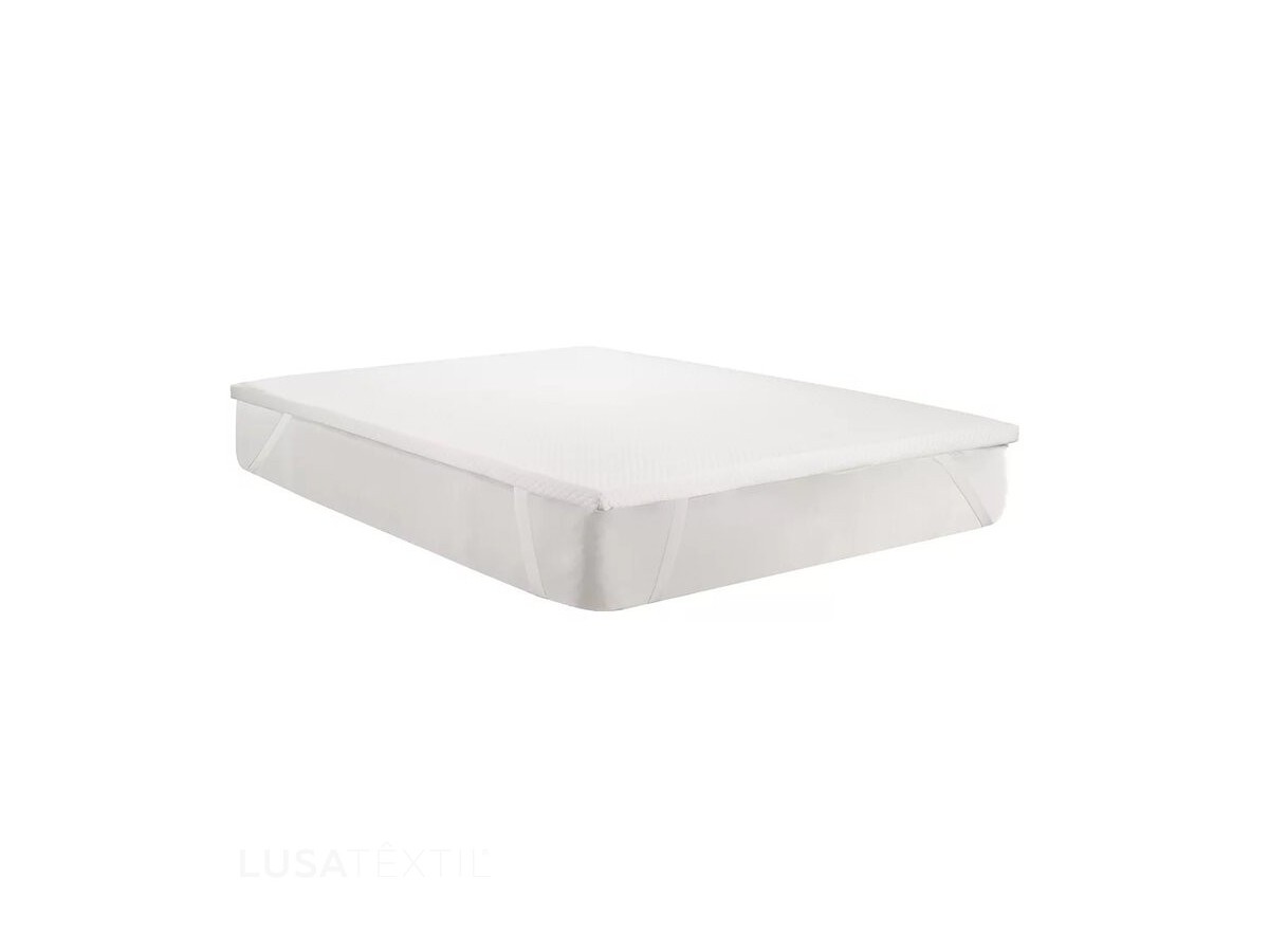 Fixação: Base antiderrapante e quatro elásticos que garantem um ajuste perfeito ao colchão