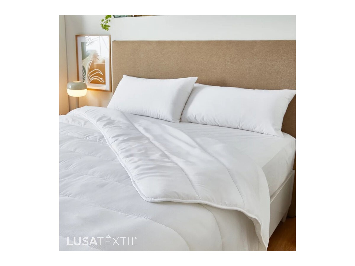Enchimento de edredom em fibra oca, projetado para oferecer alta capacidade térmica nos meses ou ambientes mais frios, permanecendo leve e macio para um conforto envolvente