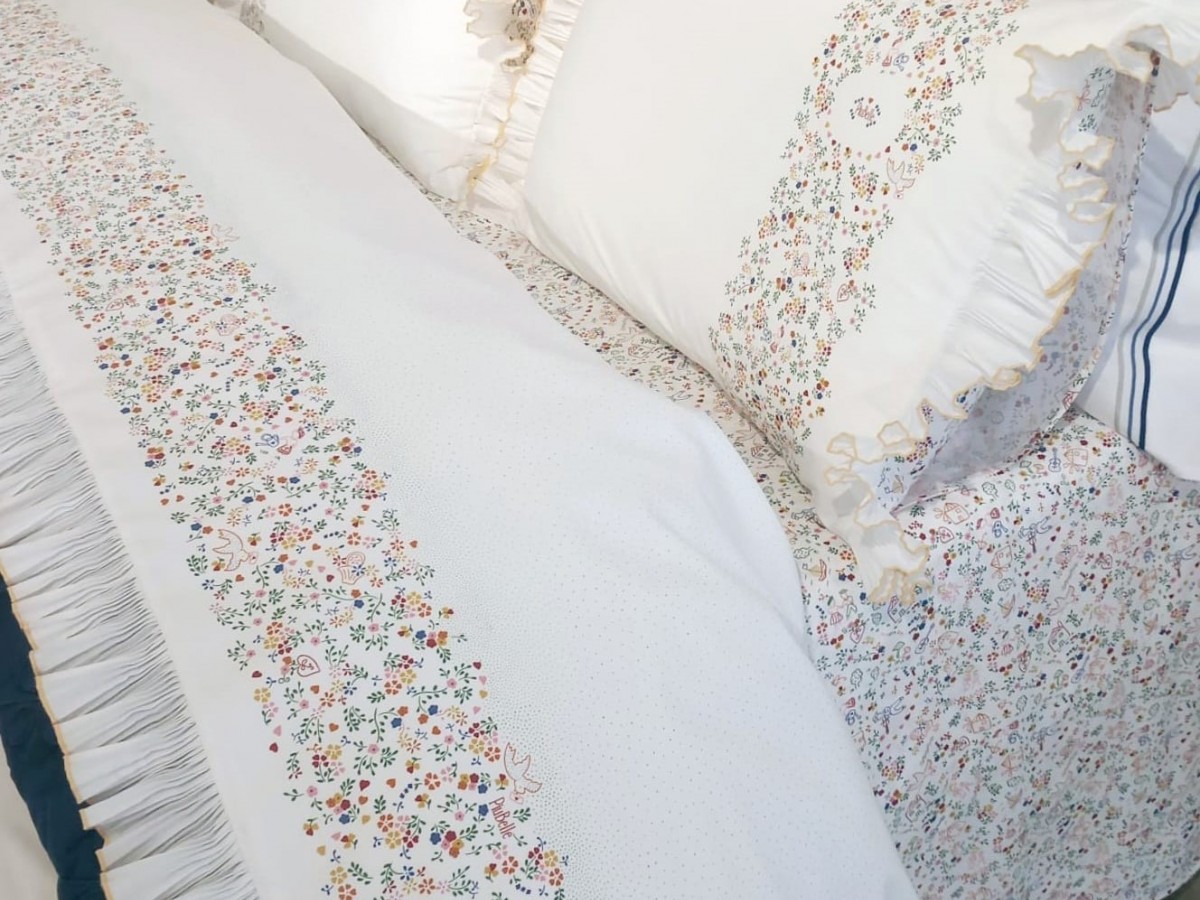- 260X290: 1 lençol de baixo 260X290 + 1 lençol de cima com folhos 260X290 + 2 fronhas 50X70 com folhos